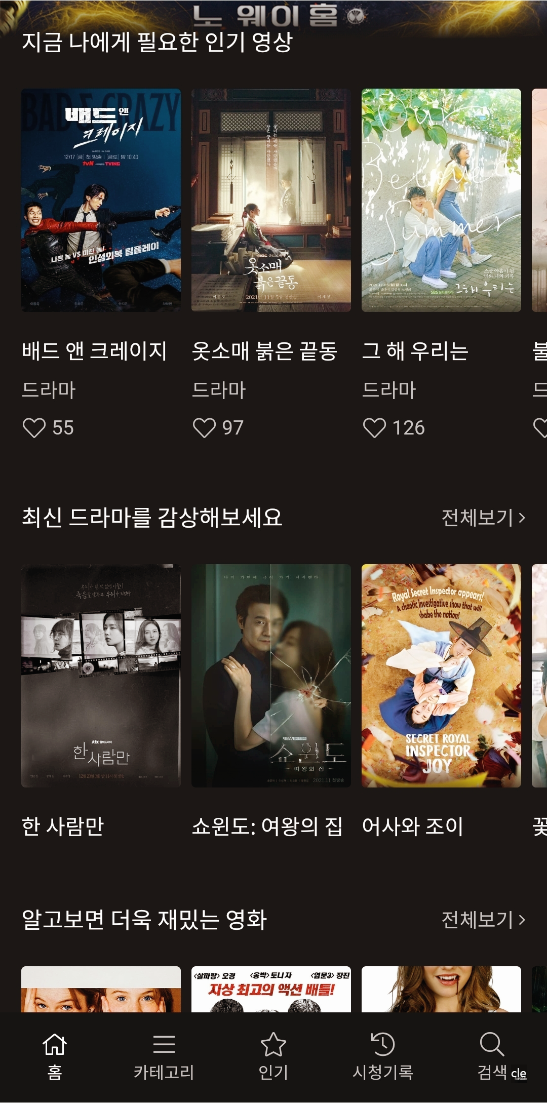 그리고 인기영상을 클릭하면 사람들이 많이 보고 있는 인기있는 순위로 라디오스타, 교섭, 스마트폰을 떨어뜨렸을 뿐인데, 카지노 시즌2, 유령, 오늘 밤, 세계에서 이사람이 사라진다 해도, 벌거벗은 한국사, 스위치, 스파이 패밀리 시즌 1 더빙 등이 있습니다.